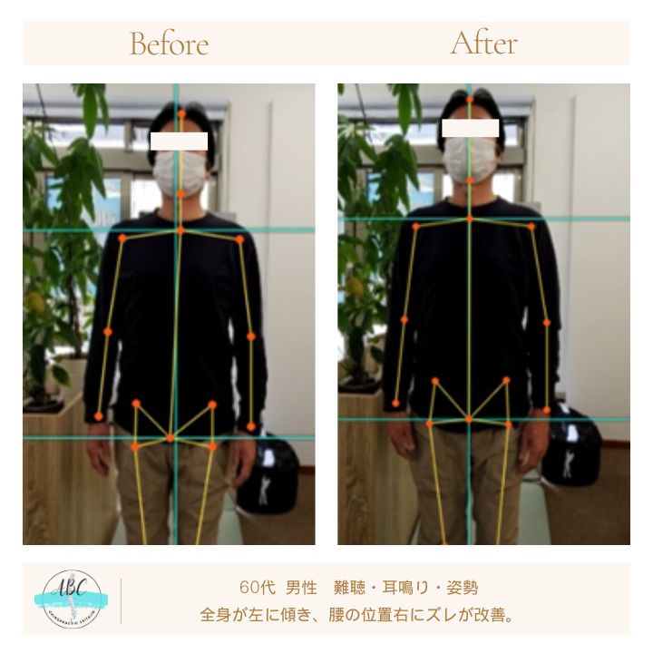 今日は、首・肩こり、耳鳴り、姿勢悪く、身体の硬い60代男性の施術前後のお写真を共有いたします。