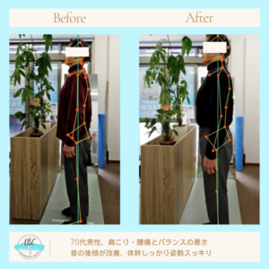 「体幹を意識するとぐらつかないね」とおっしゃっていただき、更に姿勢改善も実感していただきました。